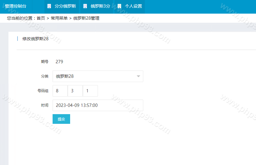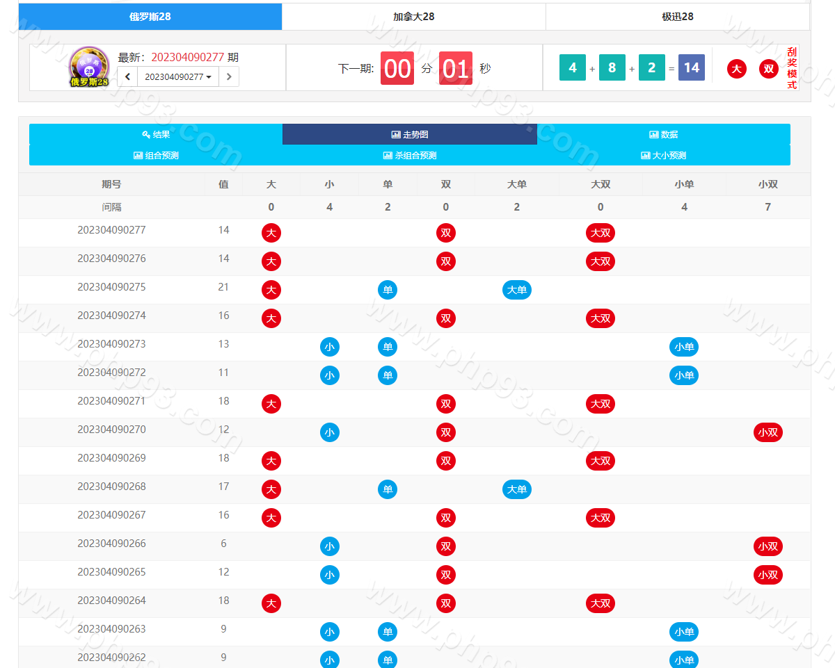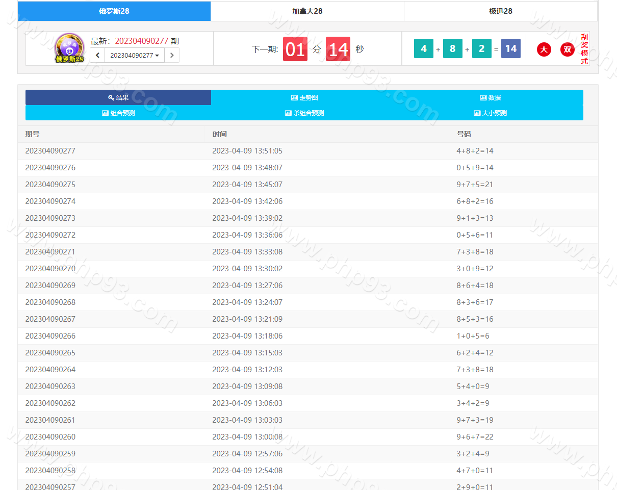 彩种有:俄罗斯28、加拿大28,极速28,也可以二次开发添加更多彩种,可以提前预设开奖结果和修改开奖结果,