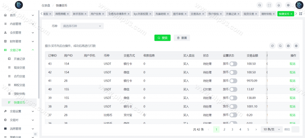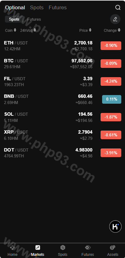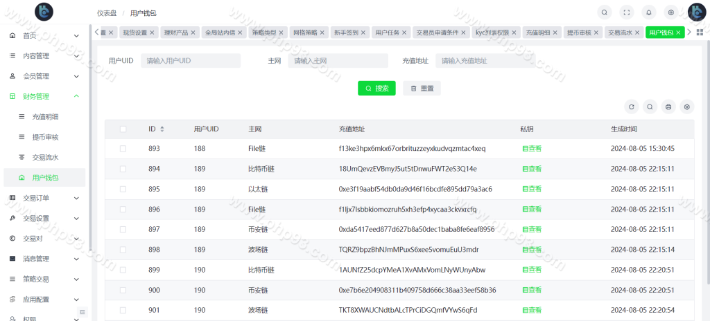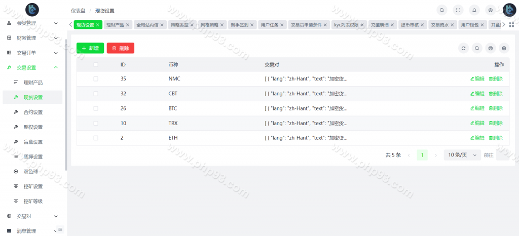 自定义币种,手续费,交易精度,交易类型(衍生品交易,币币交易,期权),是否可充值等。行情数据对接头部交易所币种行情接口。