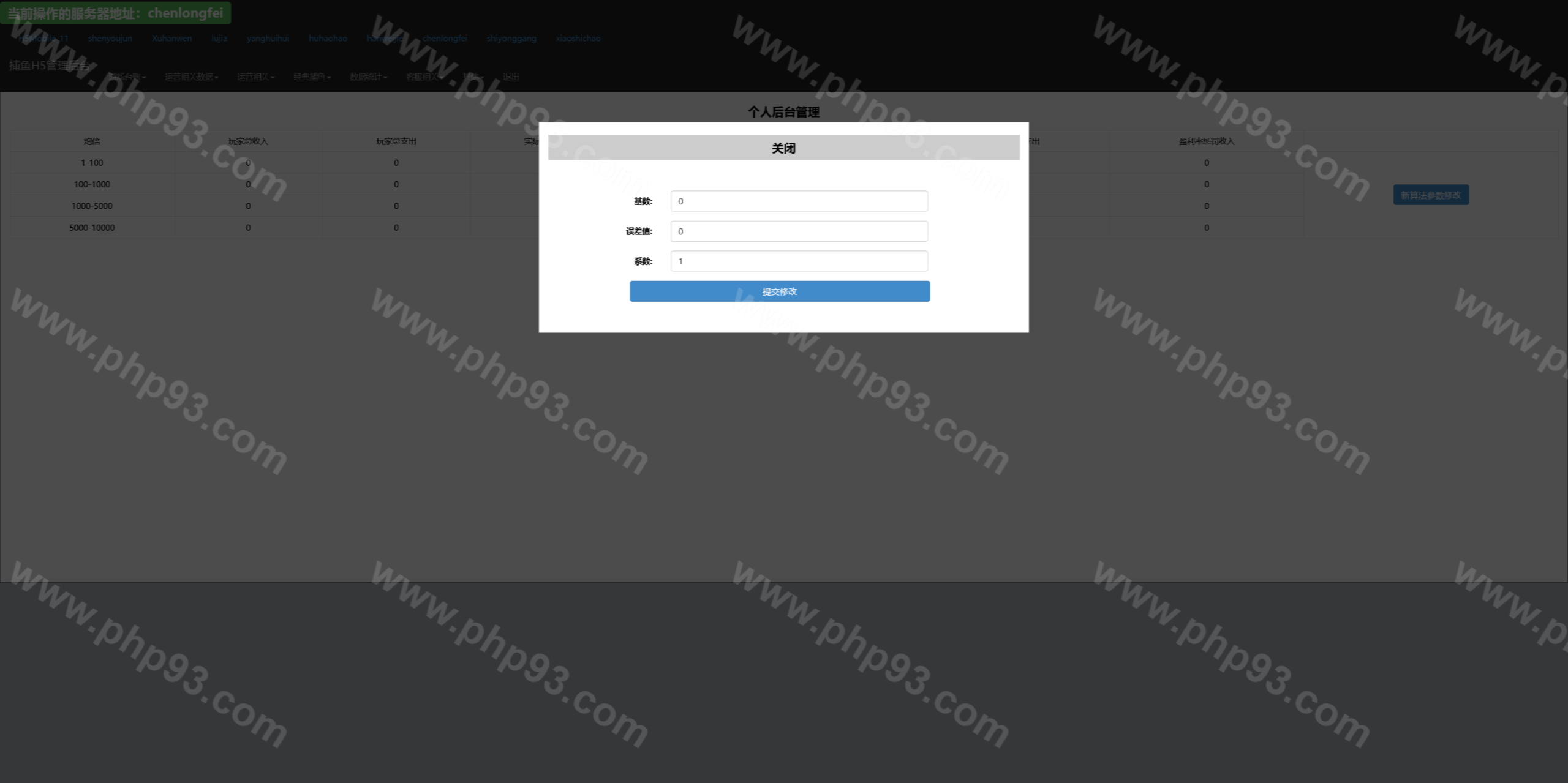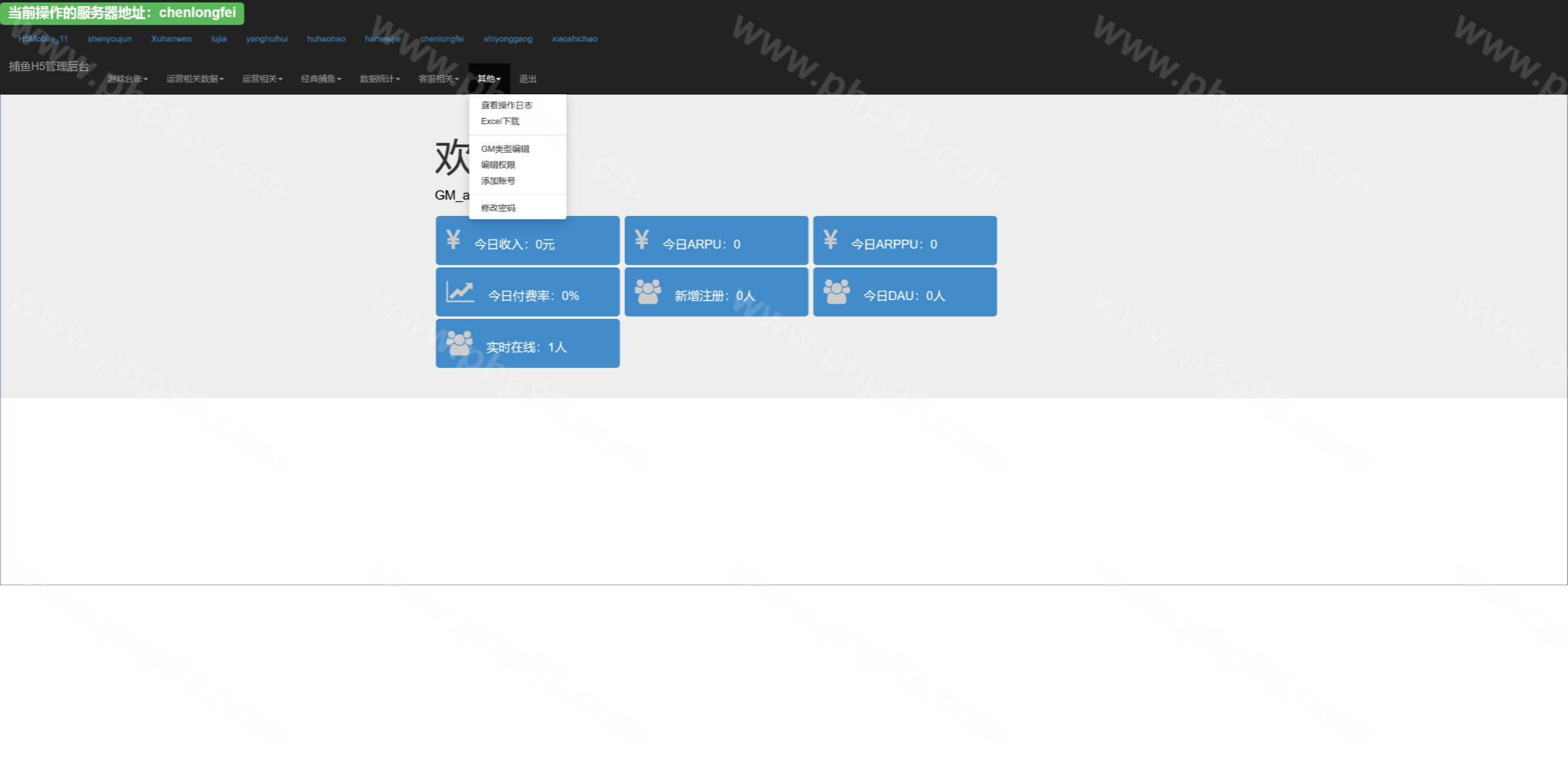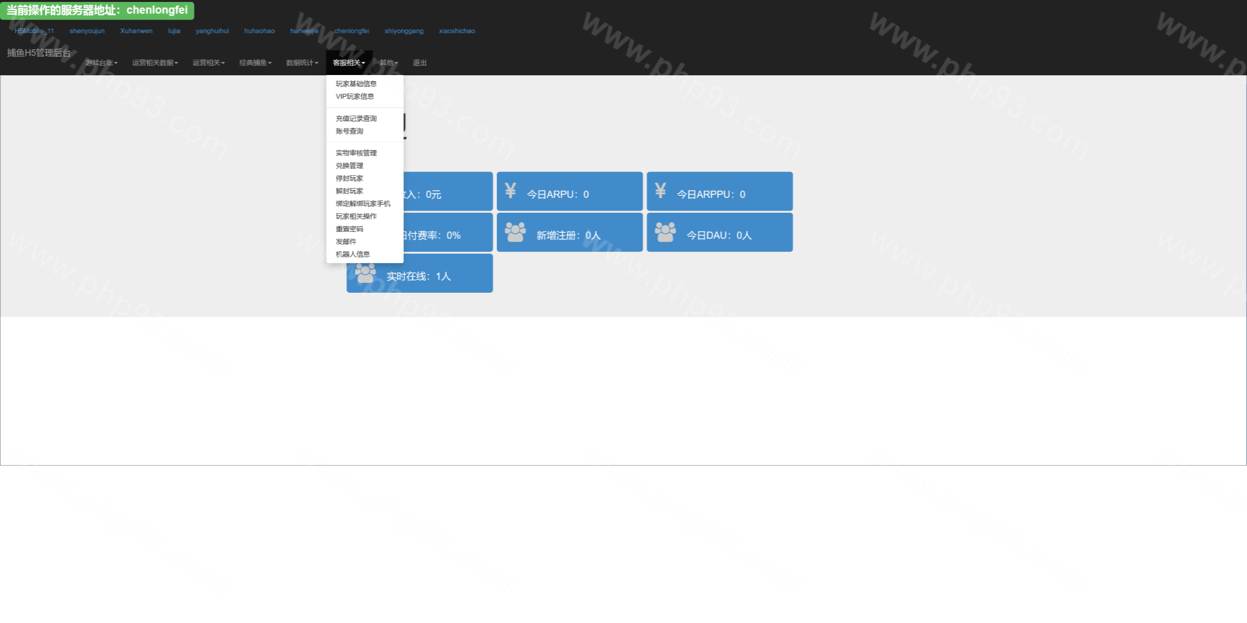 总管理后台可以针对每个渠道进行管理,网站源码中kufu是给渠道商的管理系统,控制系统分为全局参数控制、及账号点杀点送。其他的功能看上面的管理后台运行截图吧。