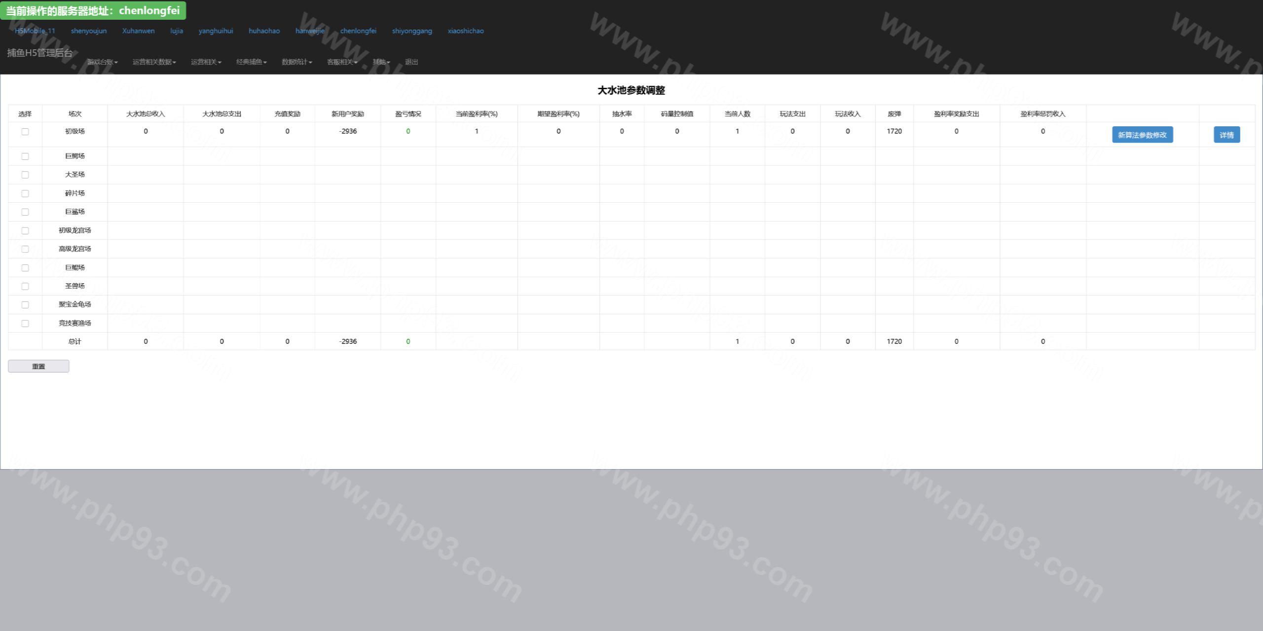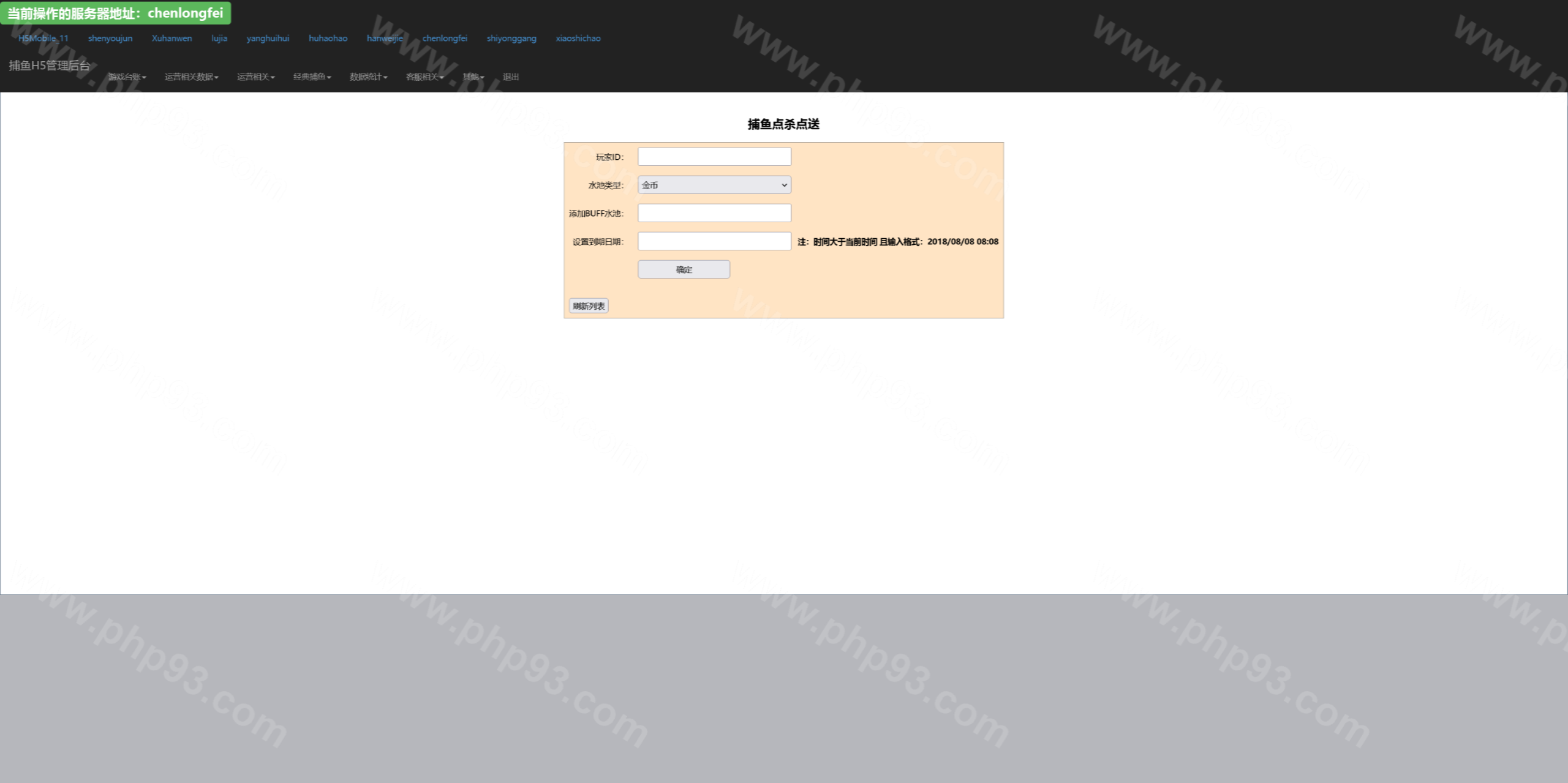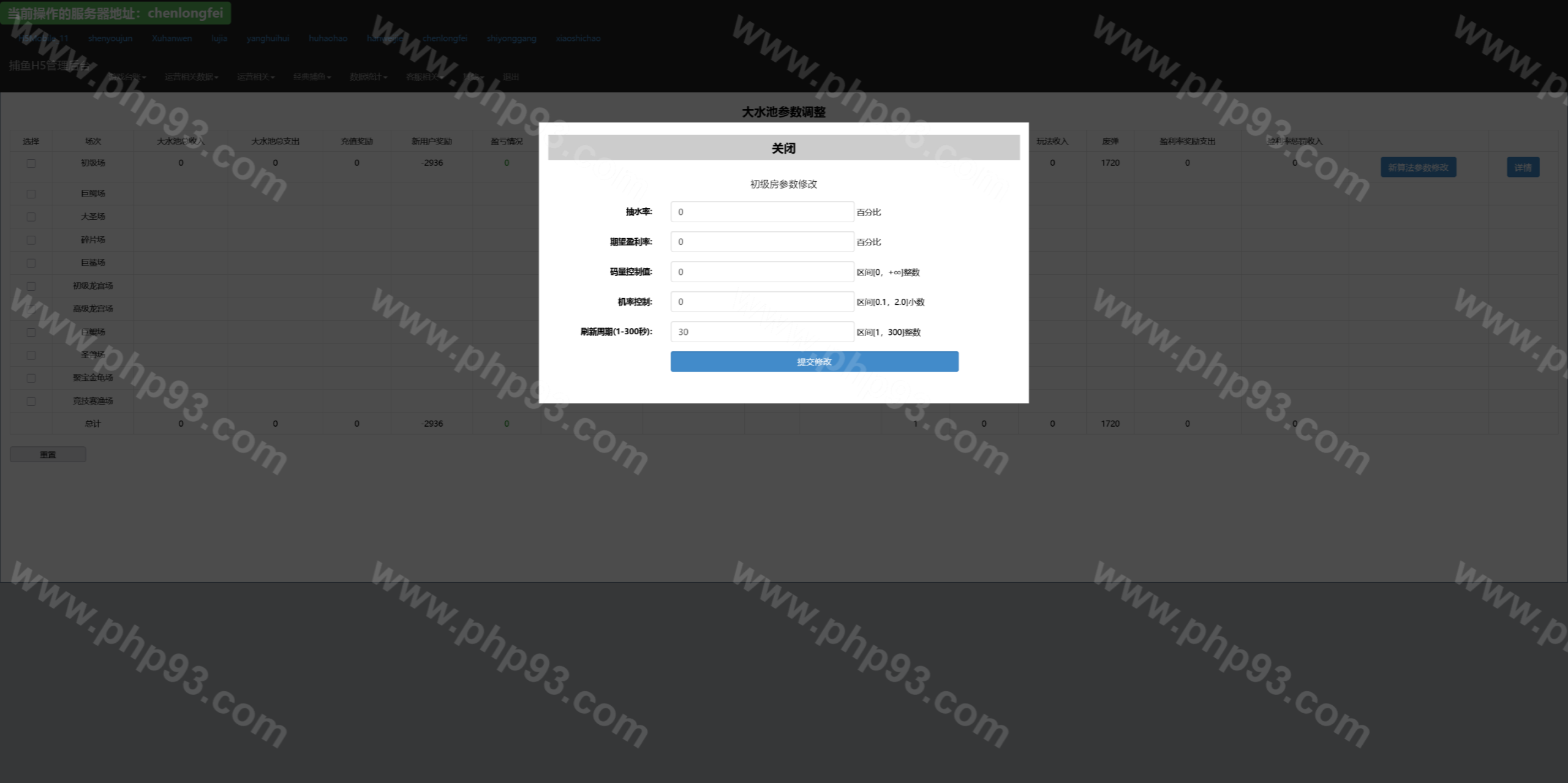 总管理后台可以针对每个渠道进行管理,网站源码中kufu是给渠道商的管理系统,控制系统分为全局参数控制、及账号点杀点送。其他的功能看上面的管理后台运行截图吧。