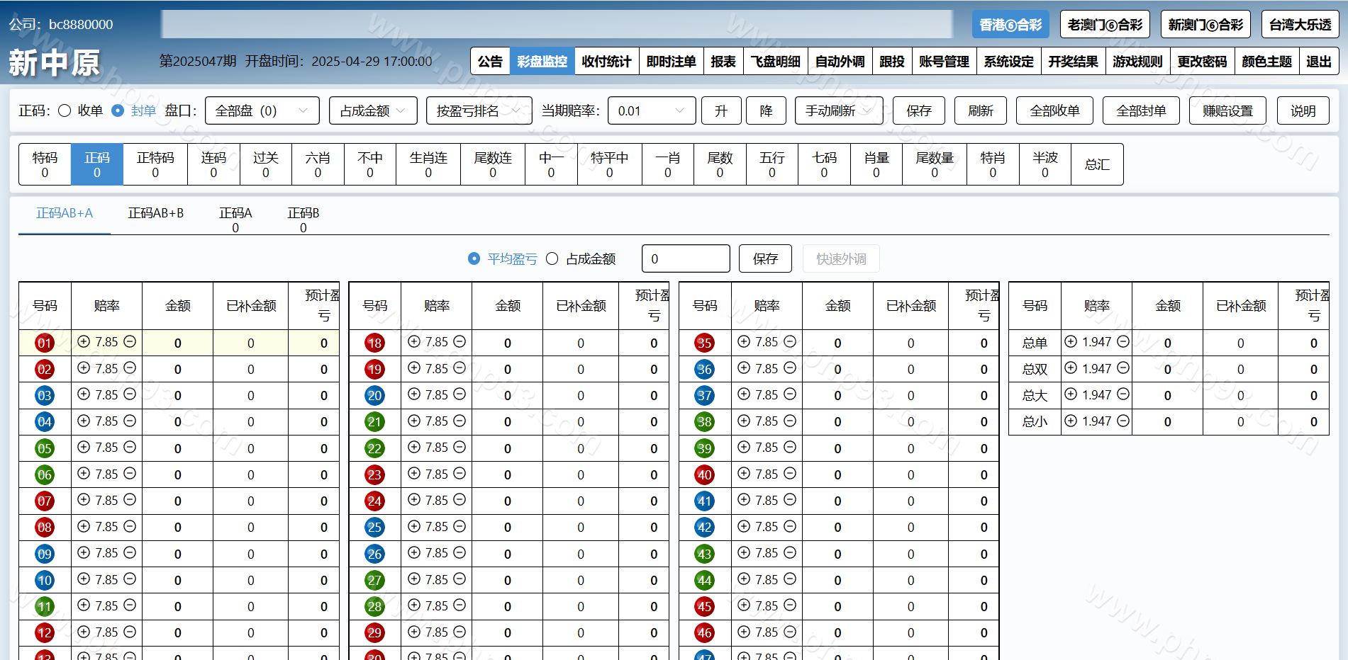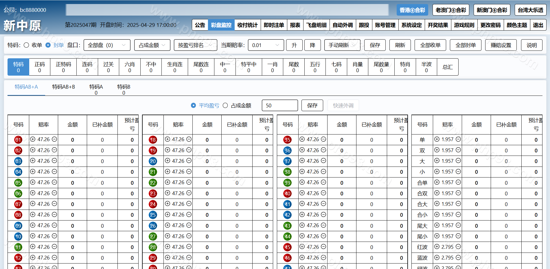 特色①后台可单独开启或关闭任意一个代理及会员的彩种。任意更改公司名称及安全码。可单独设置任意一个代理的赚赔率功能,可设置自动外调(自动生成外调注单)