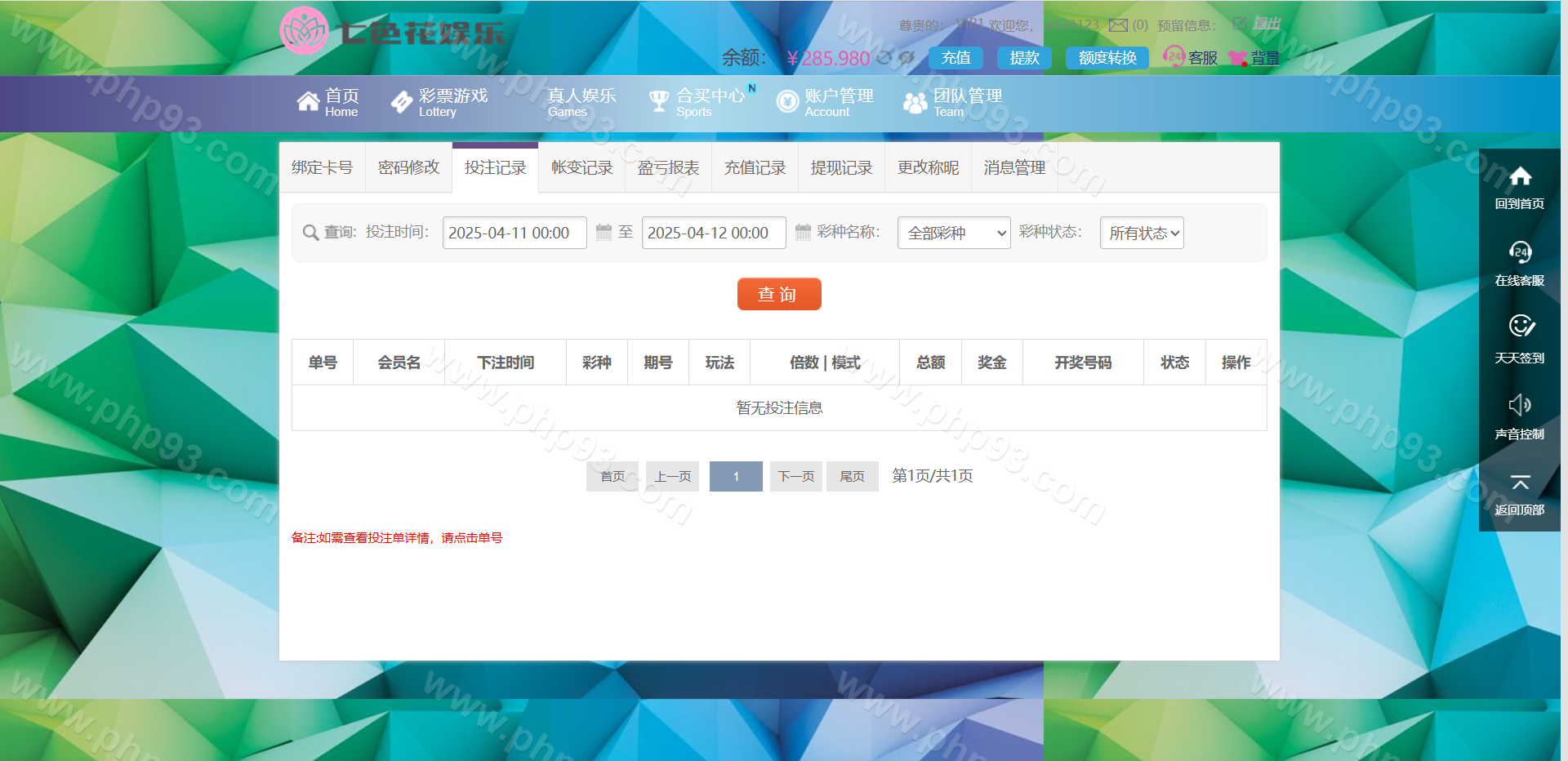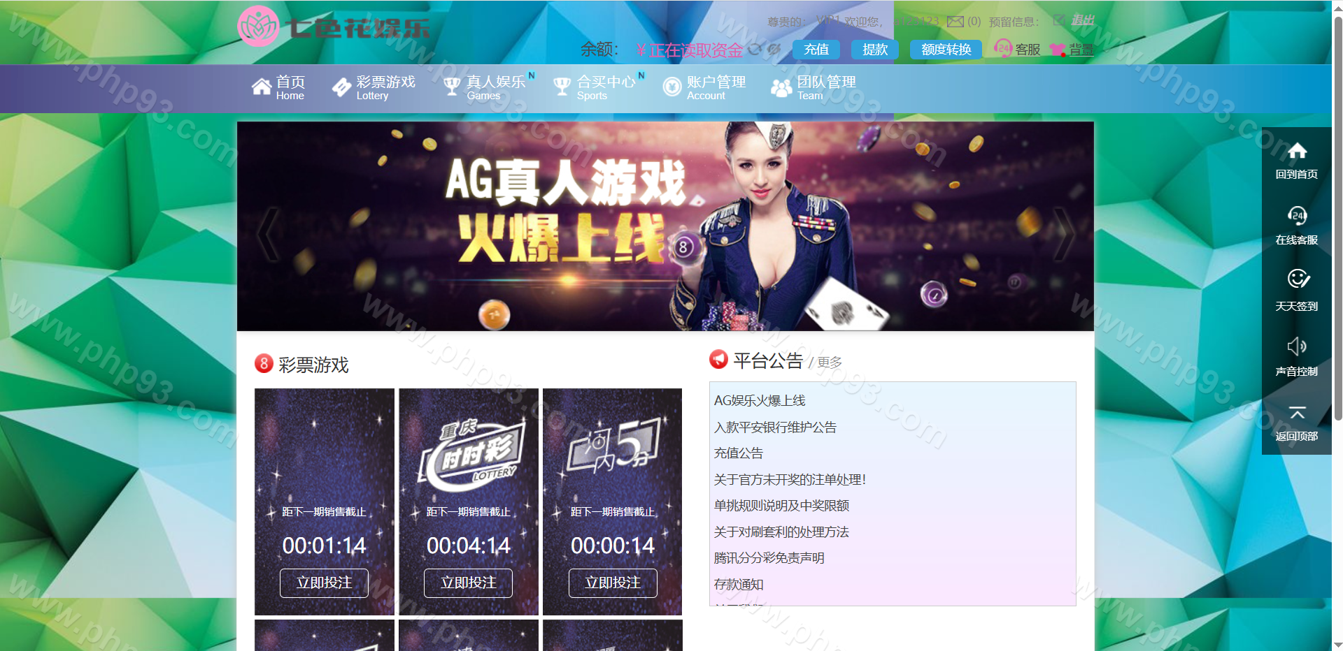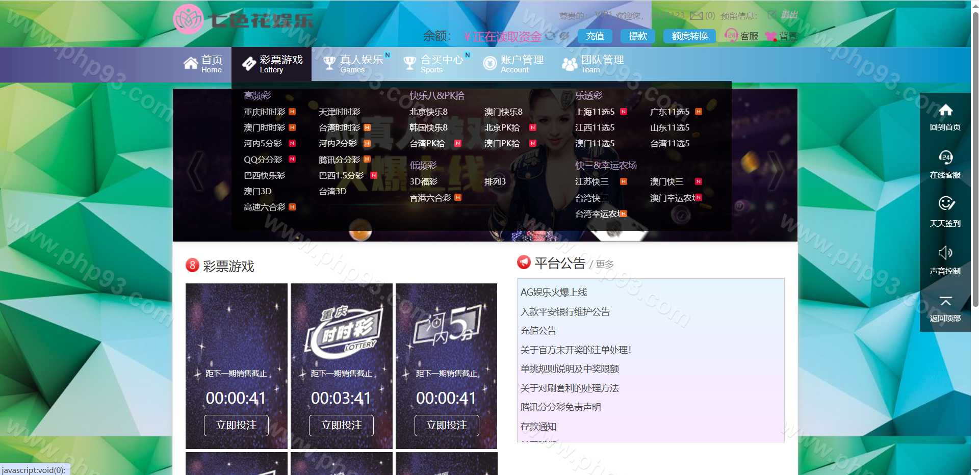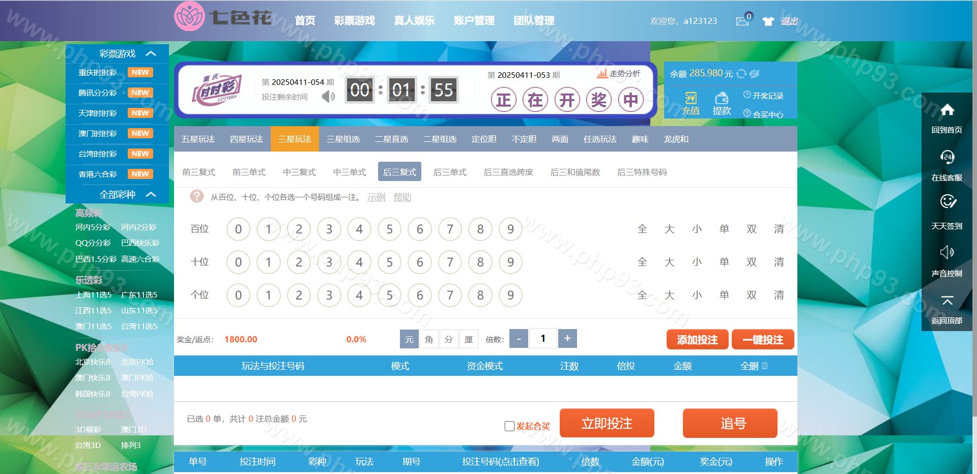 杏彩系统七色花ssc平台,天恒框架,PHP语言开发,杏彩改版带WAP手机版,元/角/分/厘模式,带真人接口。